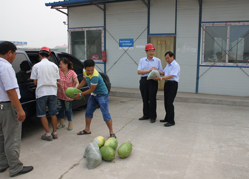 7月31日,为了表示对锦河湾项目创省级“双优”工程工作的支持,表达对在高温炎热天气下仍坚持施工的锦河湾项目部员工的关怀,公司创建“双优”工作领导小组组长、副总经理赵永超,领导小组成员、总经办主任曹随成、企宣部经理李延海等前往锦河湾项目部“送清凉”。共为锦河湾项目部送去绿豆50斤,白糖20斤,西瓜约400斤。在今后的几天里,他们还将为其他项目部“送清凉”。