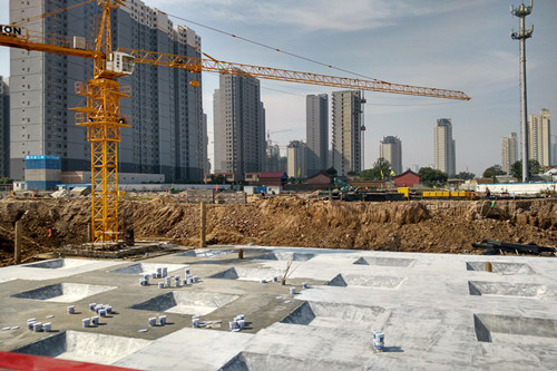 俪城三期3号楼负二层正在进行打灰