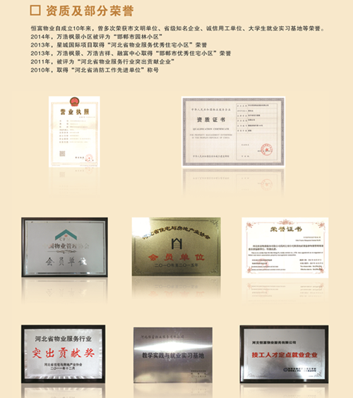 恒富物业自成立10年来,曾多次荣获市文明单位、省级知名企业、诚信用工单位、大学生就业实习基地等荣誉。