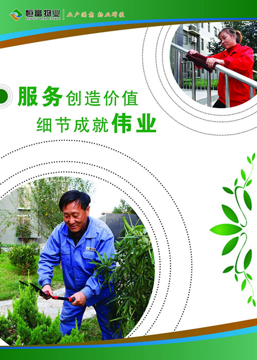“整洁、有序、美丽、和谐”是我们的服务理念, “业户满意、物业增值”是我们服务的核心目标。公司高瞻远瞩,为顾客长远之需求,持续进行物业管理专业研究与探索,藉此不断提高服务水准,努力为业户提供符合行业发展趋势的专业化服务。